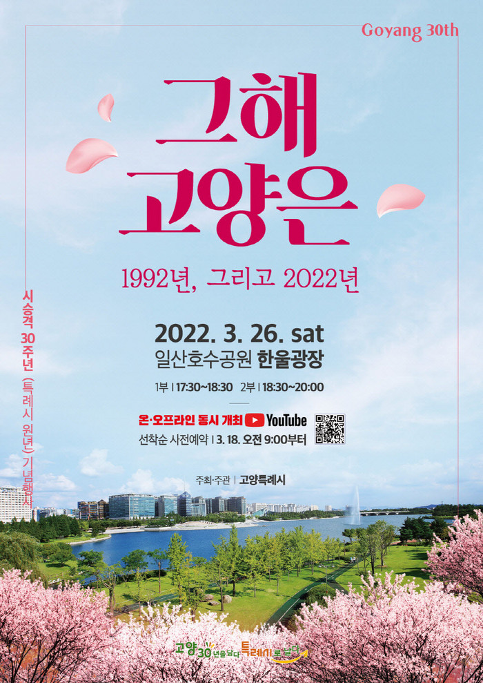 행사는 오는 3월 26일(토) 17시 30분 일산호수공원 한울광장에서 진행된다. 시민들과 함께 고양 시승격 30주년과 고양특례시의 새로운 시작을 축하하기 위해 시민이 참여하는 무대를 비롯해 다양한 볼거리가 열릴 예정이다.