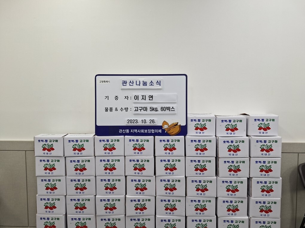 [부자동네타임즈 = 김인수 기자] 고양특례시 관산동은 지난 26일 주민 이지연님으로부터 내유동에서 손수 재배한 고구마 60박스(1박스 당 5kg)를 전달받았다고 밝혔다.
