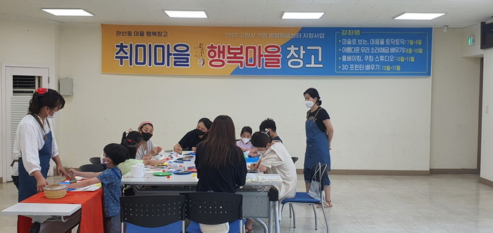 관산동 주민자치회는 지난 5월 공모를 통해 고양시 거점 평생학습센터로 지정되었으며 7월부터 11월까지 ▲미술 심리치료 ▲해금 배우기 ▲쿠킹 스튜디오 ▲3D 프린터 배우기 총 4개의 강좌를 마을행복창고 개관 전까지 행정복지센터에서 운영할 예정이다.