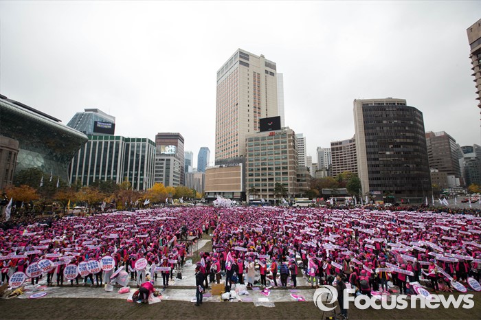 | △ 지난 14일 오후 서울광장에서 열린 민중총궐기대회에서 전국학교비정규직노동조합 소속 참석자들이 비정규직 철폐, 처우개선 등을 요구하며 집회를 하고 있다. <사진제공=포커스뉴스> |
