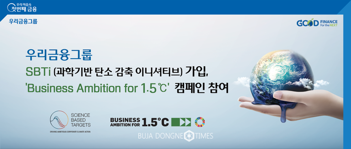 [부자동네타임즈 이현재 기자]우리금융그룹은 탄소중립(Net Zero) 달성을 위한 로드맵의 일환으로 글로벌 이니셔티브 ‘과학 기반 감축목표 이니셔티브(Science Based Targets initiative, SBTi)’에 가입하고, ‘비즈니스 앰비션 포 1.5℃(Business Ambition for 1.5℃)’ 캠페인에 참여한다고 8일 밝혔다.