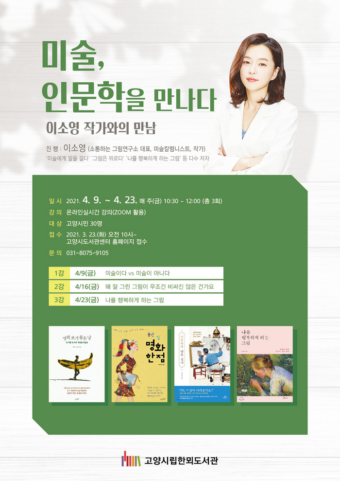 [부자동네타임즈 김인수기자] 고양시 한뫼도서관은 코로나19의 장기화로 문화 소외 현상을 겪고 있는 고양시민을 위해 오는 4월 9일부터 문화 예술 프로그램 ‘미술, 인문학을 만나다’를 운영한다.