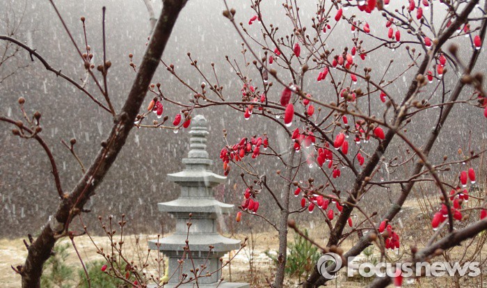 (포천=포커스뉴스) 전국의 기온이 뚝 떨어진 25일 오전 경기도 포천시 관인면 도연암의 산수유 사이로 함박눈이 내리고 있다. <사진제공=도연스님> 포커스포토 photo@focus.kr