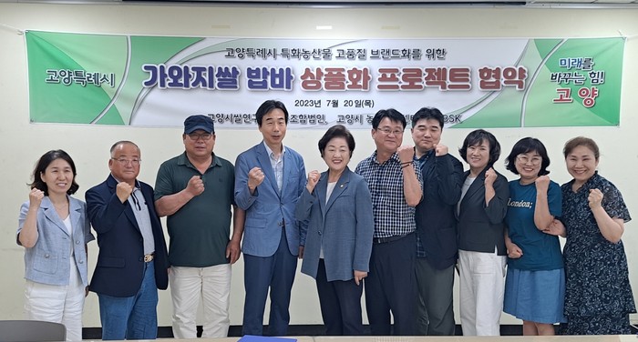[부자동네타임즈 김인수기자] 농업기술센터는 지난 7월 20일 고양시쌀연구회(대표이사 김지필)와 (주)비에스케이(대표 이진구)와 함께 가와지1호쌀을 이용한 밥바 상품화 업무협약을 체결했다.