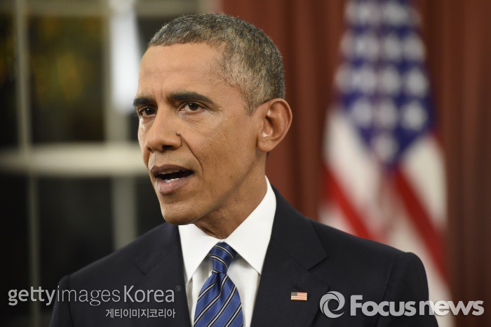| △ (워싱턴/미국=게티/포커스뉴스) 버락 오바마 미국 대통령은 6일 오후 8시(현지시간) 백악관 집무실에서 진행한 대국민 연설에서 "(샌버나디노 총기난사 사건은) 무고한 시민을 살해한 테러 행위"라고 목소리를 높이고 있다. ⓒ게티이미지/멀티비츠 photo@focus.kr |