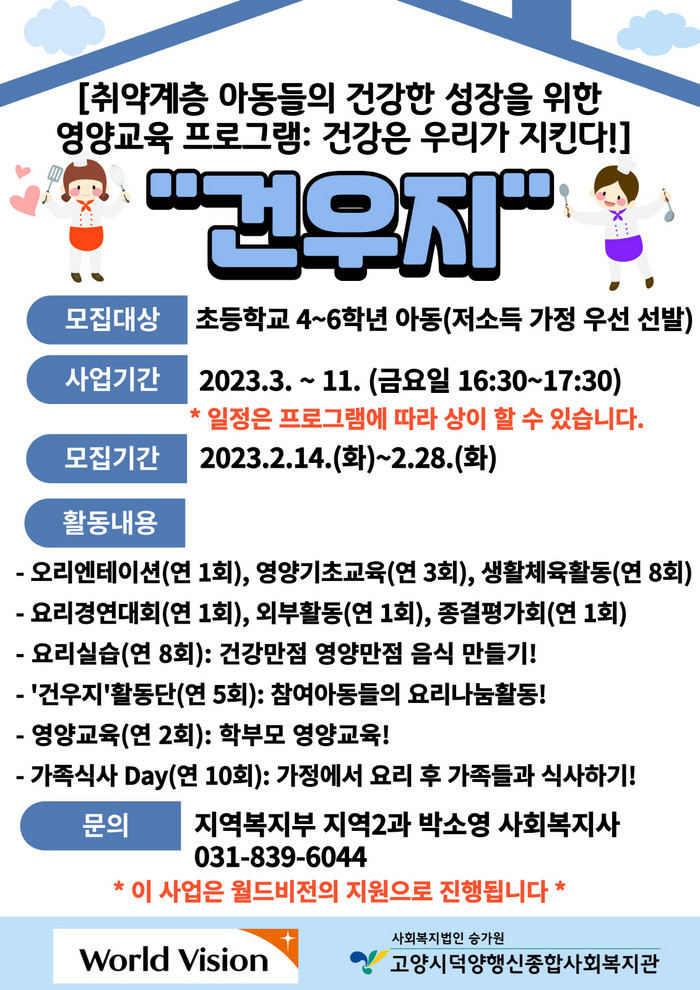 세부적으로는 ▲아동의 건강한 식습관 형성을 위한 ‘영양기초교육’ ▲아동의 건강한 요리 만들기 ‘요리실습’ ▲지역사회 나눔 실천활동 ‘건우지’ 활동단 ▲아동의 신체적 건강 증진활동 ‘아동생활체육’ ▲아동의 식습관 중요성 인식을 위한 학부모 대상 ‘아동영양교육’을 진행한다.