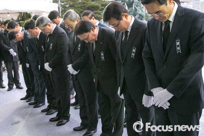 (서울=포커스뉴스) 25일 오전 서울 여의도 국회 고 김영삼 전 대통령 국가장 분향소에서 박근희(오른쪽 세번째) 삼성사회공헌위원회 부회장을 비롯한 삼성그룹 사장단이 묵념하고 있다.
