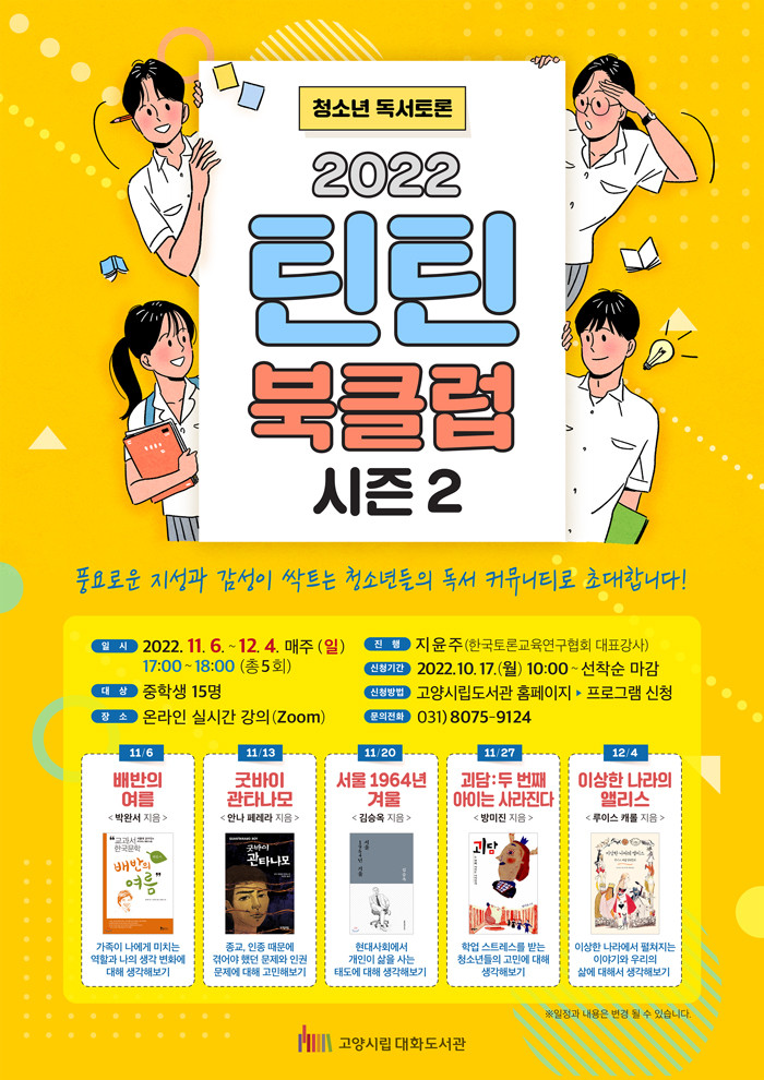[부자동네타임즈 김인수기자] 고양특례시(시장 이동환) 대화도서관이 오는 11월 6일부터 12월 4일까지 매주 일요일 오후 5시부터 청소년 독서토론 프로그램 2022 틴틴 북클럽 시즌2을 온라인으로 운영한다.