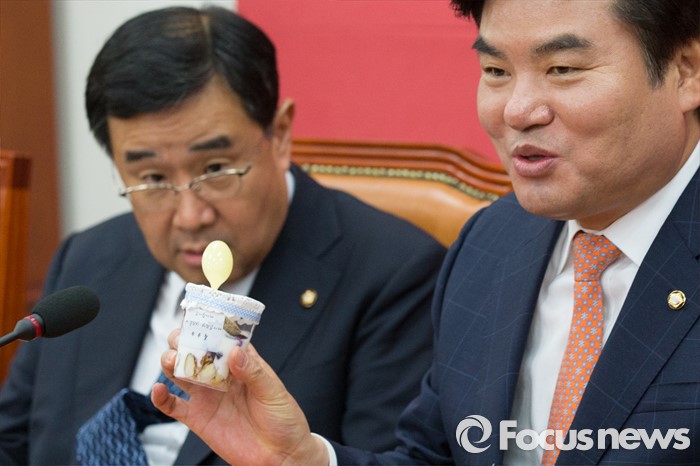 | △ 원유철(오른쪽) 새누리당 원내대표가 21일 오전 서울 여의도 국회 집무실에서 취임 100일 기자간담회에 참석해 100일 기념 자축 요구르트를 들어보이고 있다. 박철중 기자 cjpark@focus.kr |