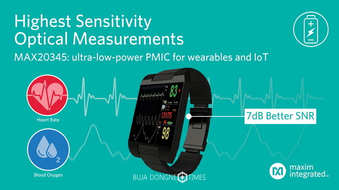 상시 접속(Always-on) 웨어러블 및 사물인터넷(IoT) 디바이스 설계자는 MAX20345를 사용해 손쉽게 폼팩터 크기를 줄이고 배터리 작동 시간을 늘릴 수 있다. 초저전력 MAX20345는 리튬 충전기를 통합하고 웨어러블 피트니스와 헬스 애플리케이션의 광학 측정 민감도를 최적화하는 독특한 아키텍처를 구현했다.