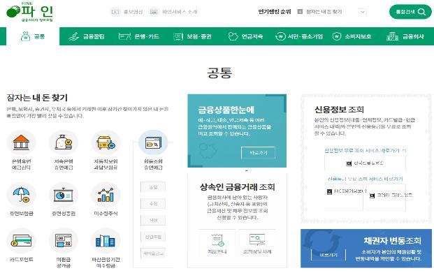 이용자가 가장 많이 검색한 코너는 '잠자는 내 돈 찾기'(41.9%)였고 '금융상품 한눈에'(10.7%), '은행계좌 통합관리'(8.3%), '카드포인트 통합조회'(6.6%)', '통합연금포털'(5.8%) 등의 순으로 이용이 잦았다.
