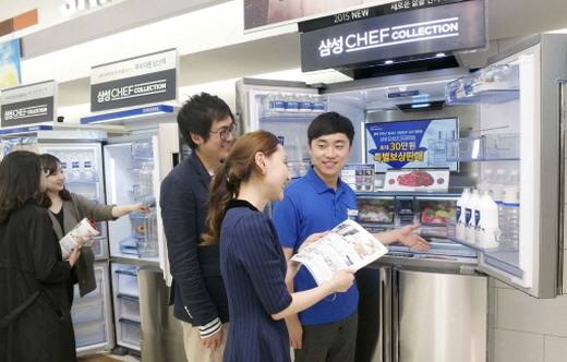 △ 삼성 디지털프라자 강서본점에 방문한 고객들이 삼성전자 슈퍼 프리미엄 냉장고 ‘셰프컬렉션’을 살펴보 고 있다. <사진제공=삼성전자> |