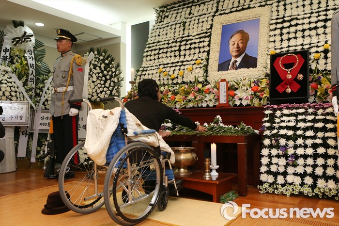 | △ 지난 24일 오후 서울 종로구 서울대병원 장례식장에 마련된 故 김영삼 전 대통령 빈소에서 휠체어를 탄 조문객이 헌화하고 있다. 사진공동취재단 photo@focus.kr |