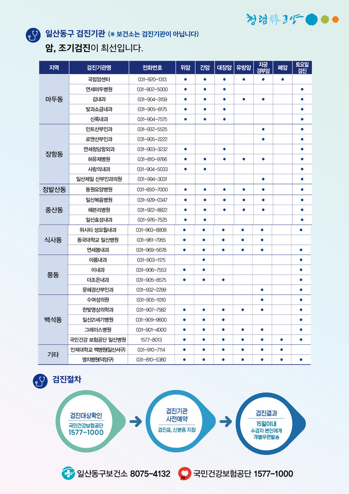 [부자동네타임즈 김인수기자] 고양시(시장 이재준) 일산동구보건소는 2020년 국가암검진 사업이 시작됨에 따라 짝수년도 출생 대상자에 대한 수검 독려 활동에 나셨다.