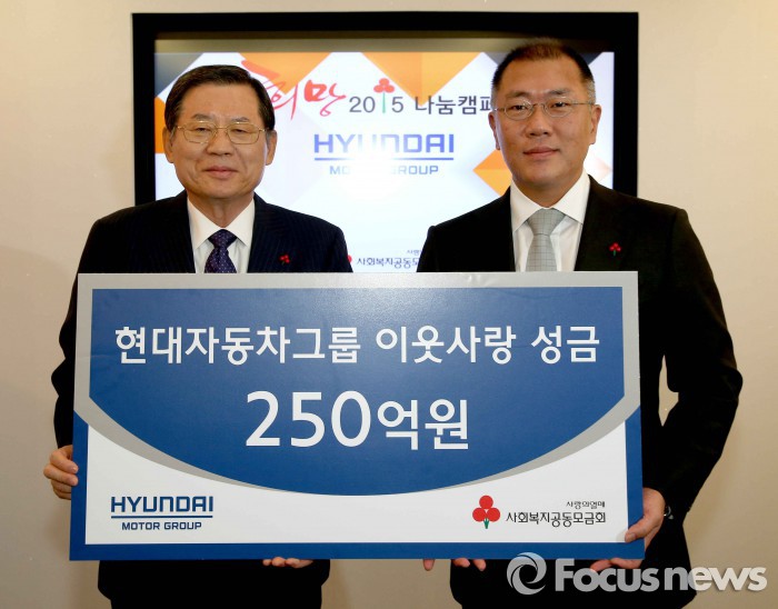 [부자동네타임즈 이채봉 기자] 현대자동차차그룹은 23일 서울 중구 사회복지공동모금회 건물에서 정의선 현대차 부회장, 허동수 사회복지공동모금회장 등이 참석한 가운데 연말 이웃돕기 성금 250억원을 전달했다고 밝혔다.