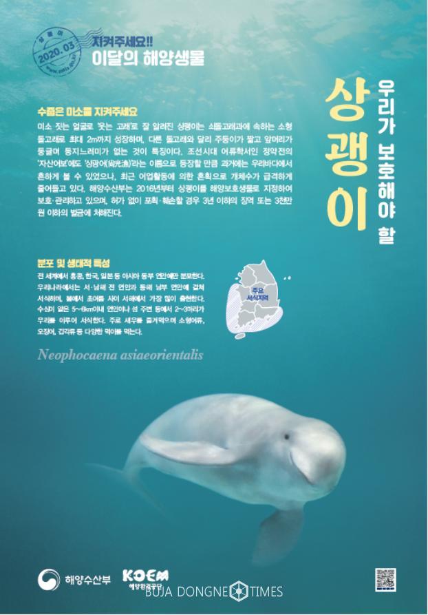 [부자동네타임즈 이교영 기자]해양수산부는 수줍게 미소 짓는 얼굴을 가져 ‘웃는 고래’라고 불리는 ‘상괭이’를 3월 이달의 해양생물로 선정하였다.