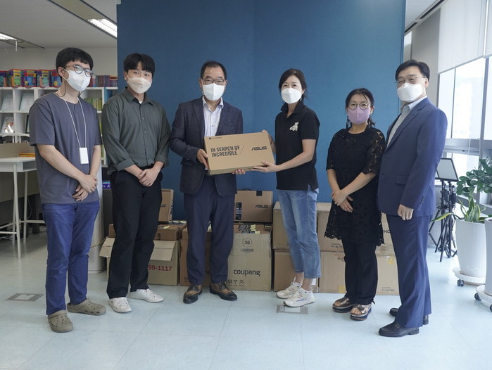 [사진설명] ㈜참빛교육 관계자가 고양시 지역아동센터 협회에 노트북 30대를 전달하고 있다.