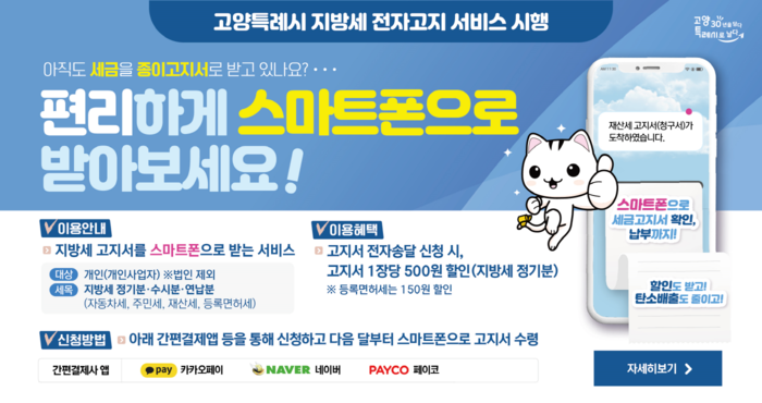 [부자동네타임즈 김인수기자] 고양특례시(시장 이동환)가 세금고지서를 종이고지서 대신 스마트폰으로 받아보는 지방세 전자송달 서비스를 시행하고 있다. 시는 서비스 미가입자 12만명에게 가입 안내문자를 발송하는 등 홍보에 힘쓰고 있다.