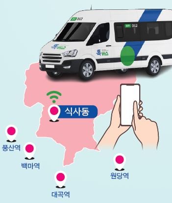 일정한 노선 없이 구역 내에서 승객의 호출에 따라 이동하는 수요응답형 버스(DRT)‘고양똑버스’7대가 식사‧고봉 지역에서 오는 6월 27일 운행을 시작한다. 식사‧고봉지역은 대중교통 이용 수요가 일정하지 않고, 장거리로 인해 운행 노선이 적어 주민들이 교통 이용에 불편을 겪어왔다.