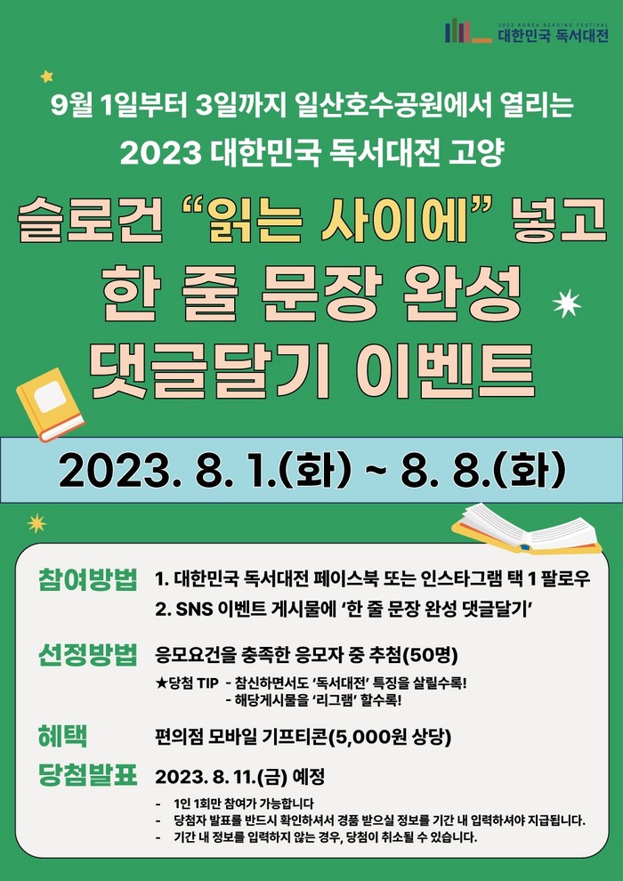 당첨자는 8월 11일에 독서대전 공식 홈페이지와 인스타그램, 페이스북에 공지될 예정이다.