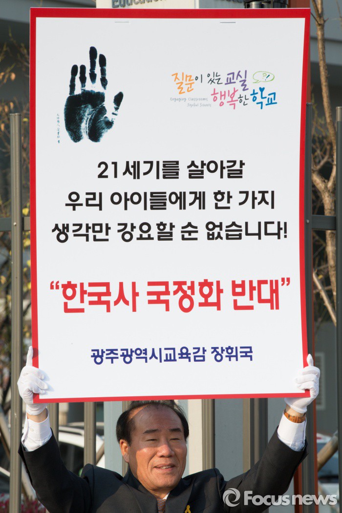 | △ 장휘국 광주광역시교육감이 2일 오전 세종시 정부세종청사 교육부 앞에서 한국사 교과서 국정화 반대 1인 피켓시위를 하고 있다. 김기태 기자 presskt@focus.kr |