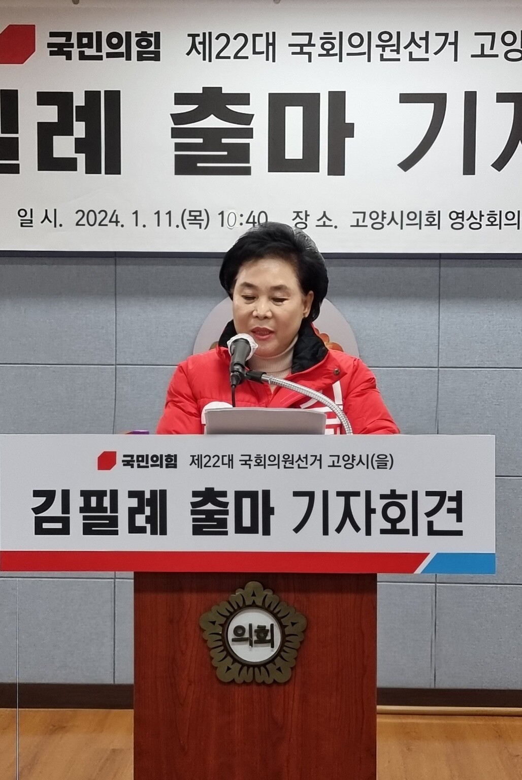 [사진설명] 국민의힘 김필례 전 고양시을 당협위원장 제22대 국회의원선거에 출마 선언을 하고 있다.