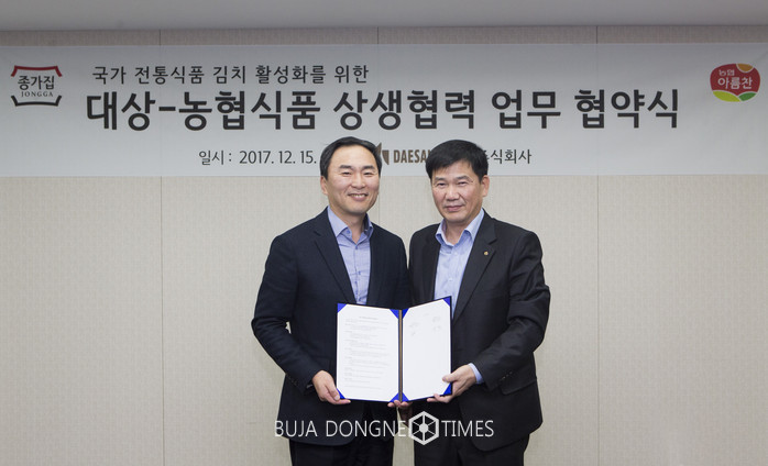 양사는 서울 신설동 대상㈜ 본사에서 국산 농산물을 활용한 포장김치 개발 협력 및 생산, 절임배추 등 김치 소재 농산물의 공동사업을 골자로 하는 업무협약식을 가졌다.