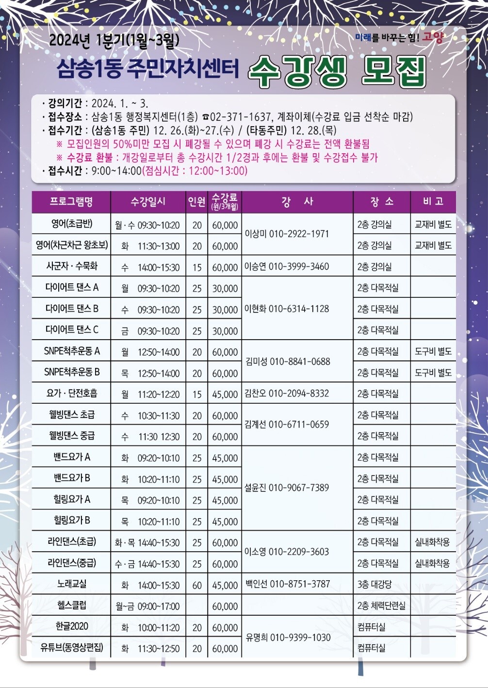 [부자동네타임즈 = 김인수 기자] 고양특례시 삼송1동 주민자치센터는 오는 12월 26일부터 28일까지 2024년 1분기 주민자치센터 문화강좌 프로그램 수강생을 모집한다.