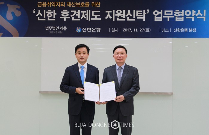 [부자동네타임즈 이현재 기자]신한은행은법무법인 세종과 ‘금융취약자의 재산보호를 위한 후견제도 지원신탁 활성화 업무협약’을 체결했다고 28일(화) 밝혔다.