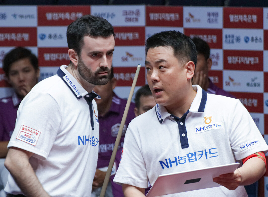 3세트서는 ‘팀 리더’ 조재호가 최성원에 15:6(7이닝) 승리를 거두며 세트스코어 2:1로 리드하기 시작했고, 4세트서는 김현우와 김민아가 하비에르 팔라존(스페인)과 장가연을 9:7(4이닝)로 꺾은 데 이어, 5세트서는 안토니오 몬테스(스페인)가 사이그너를 11:10(5이닝) 1점차 승리를 거두고 팀 승리를 완성했다.