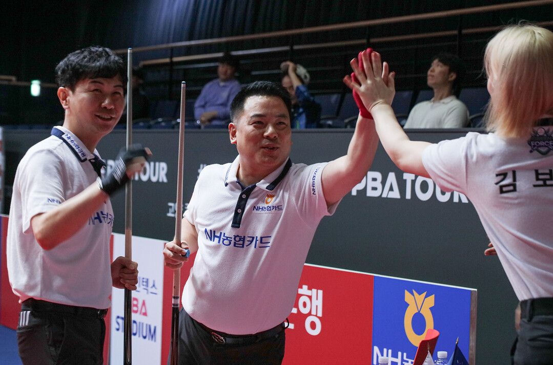지난 16일 경기도 고양시 ‘고양 킨텍스 PBA 스타디움’에서 열린 ‘웰컴저축은행 PBA 팀리그 2023-2024’ 3라운드 4일차 경기서 NH농협카드는 휴온스를 상대로 세트스코어 4:1로 승리를 거두고 단독 1위를 굳혔다.