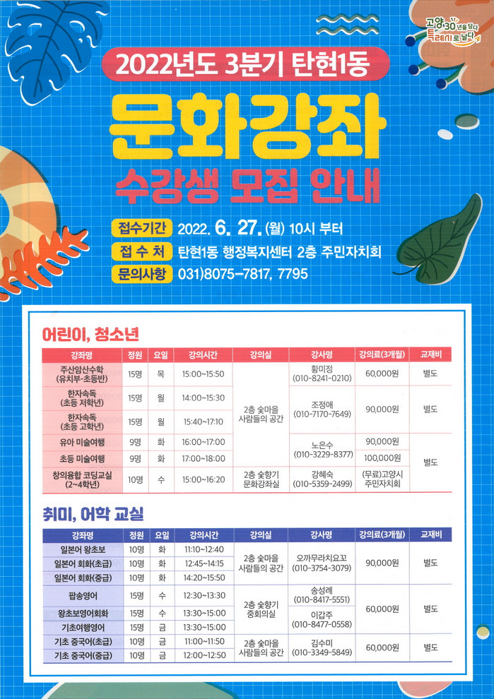 모집프로그램은 어린이.청소년 대상 창의융합 코딩교실 등 6개 강좌, 일본어 왕초보 등 8개 외국어 강좌, 노래교실 등 12개 취미 강좌, 파워근력스트레칭 등 12개 건강교실 강좌, 2개 컴퓨터 강좌 등 총 40개 강좌이며 수강 신청은 탄현1동 행정복지센터 2층 주민자치회 사무실에서 6월27일부터 마감 시까지 접수를 진행한다.