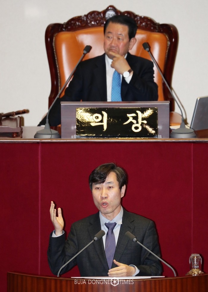 [부자동네타임즈 조영재 기자]24일 오전 서울 여의도 국회 본회의장에서 열린 제354회 국회(정기회) 제13차 본회의에서 바른정당 하태경 의원이 국회의원 보좌진 8급 비서 1명을 신설해 8명으로 늘리는 법안과 관련해 토론하고 있다. 2017.11.24.