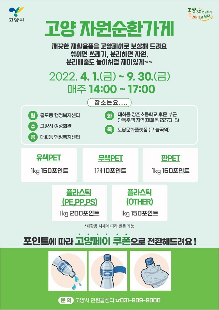 한편, 고양시는 시민들의 자발적인 분리배출 참여를 유도하기 위해 달리는 재활용가게와 자원순환가게를 운영하고 있다. 시는 집중 홍보기간 동안 온·오프라인 매체를 활용해 투명페트병 별도 배출제를 널리 알리고 시민이 일상 속에서 지속가능한 환경보호 실천을 이룰 수 있도록 유도할 계획이다.