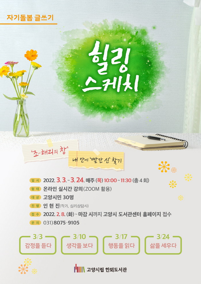 [부자동네타임즈 김인수기자] 고양시 한뫼도서관이 3월 한 달 동안 온라인 글쓰기 프로그램 힐링 스케치를 운영한다.