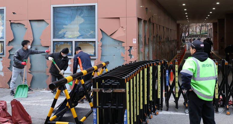윤석열 대통령이 내란 우두머리 혐의로 구속되자 일부 윤 대통령 지지자들이 서울서부지방법원 내부로 난입해 불법폭력사태를 일으킨 19일 오후 서부지법에서 청사 관계자들이 파손된 시설물과 물품 등을 치운 뒤 복구작업을 하고 있다. 2025.1.19