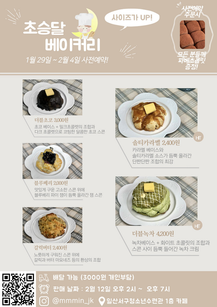 ‘초승달 베이커리’는 1인 청소년 창업 가게로, 다양한 아르바이트 경험과 베이커리 분야에 대한 관심을 바탕으로 자신이 꿈꾸는 창업에 도전하게 된 팀이다. 작년 5월부터 지금까지 창업 기획 회의, 시장 분석, 메뉴 개발, 시제품 제작, 고객 시식회 등을 직접 실천하며 가게 운영을 성실하게 준비해왔다. 작년 판매에서 부족한 점을 보완하여 한 단계 발전된 모습으로 2월 12일 토요일에 재판매를 앞두고 있다.