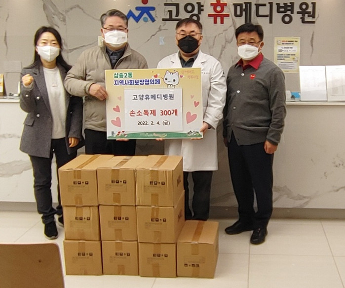 [부자동네타임즈 김인수기자] 고양시 덕양구 삼송2동 행정복지센터(동장 양재관)는 지난 4일, 고양휴메디병원(병원장 박석준)에서 관내 이웃을 위해 손소독제 300개를 기부했다고 밝혔다.