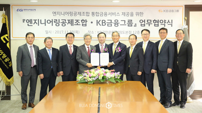 [부자동네타임즈 이현재 기자]KB금융그룹은 30일 여의도 KB금융지주 본사에서 윤종규 KB금융지주 회장과 김수보 엔지니어링 공제조합(EGI) 이사장 등이 참석한 가운데 금융-엔지니어링 협력관계 구축을 위한 포괄적 업무협약(MOU)을 체결했다고 밝혔다.