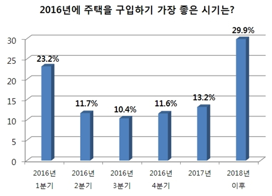 응답자의 23.2%는 2016년 1분기(1~3월)를 내집마련 적기로 봤다. 13%는 2017년을, 11.7%는 2016년 2분기(4~6월)를 꼽았다.