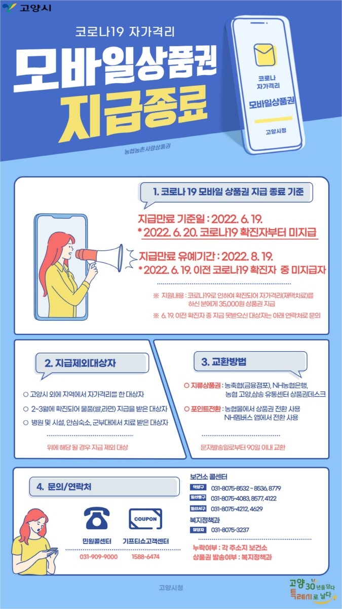 [부자동네타임즈 김인수기자] 고양시가 관내 코로나19 재택치료자들의 일상회복 지원을 위해 지급했던 구호물품 ‘농협 농촌사랑모바일상품권’ 지급을 6월 20일 확진자부터 종료한다고 밝혔다.