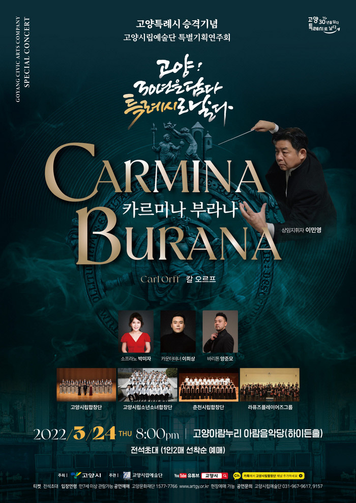 올해 1월 13일 특례시로 승격된 고양시의 비상을 응원하는 의미를 담은 이번 공연에서는 음악과 극, 무용이 어우러진 대서사 칸타타 카르미나 부라나의 전 곡이 연주된다.