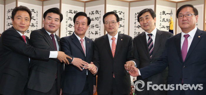 | △ 정의화(오른쪽 세번째) 국회의장이 지난 12일 오전 서울 여의도 국회 집무실에서 새누리당 원유철(왼쪽 두번째) · 새정치민주연합 이종걸(오른쪽 두번째) 원내대표와 만나 내년 농어촌 지역구와 권역별 비례대표제 등 20대 총선에 적용할 선거구획정안에 대한 여야 이견 조율 전 기념사진을 찍고 있다. 왼쪽부터 새누리당 이학재 정치개혁특위 간사, 원유철 원내대표, 이병석 정치개혁특위 위원장, 정 의장, 새정치민주연합 이종걸 원내대표, 김태년 정치개혁특위 간사. <사진제공=포커스뉴스> |