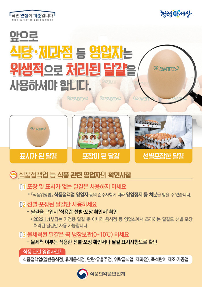 ‘달걀 선별·포장 유통제도’는 해썹(HACCP)을 적용하는 식용란선별포장업소에서 달걀을 선별·세척·건조·살균·검란·포장한 후 유통토록 하는 제도다. 가정용 달걀은 작년 4월부터 선별·포장 제도를 시행했으나 올해부터는 업소용 달걀까지 확대 적용한다.