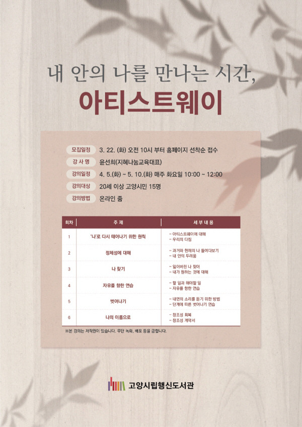 [부자동네타임즈 김인수기자] 고양시 행신도서관은 성인을 대상으로 4월 5일(화)부터 자기개발워크숍 프로그램 내 안의 나를 만나는 시간, 아티스트웨이를 운영한다.