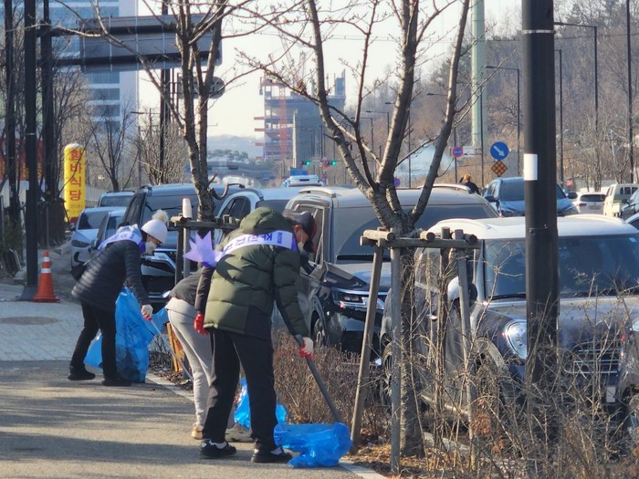 쌀쌀한 아침 기온에도 불구하고 15여 명의 주민자치위원들이 향동지구 내 꽃향기 공원에 모여 약 2시간 동안 향동로와 다세대주택 단지의 쓰레기를 청소했다.