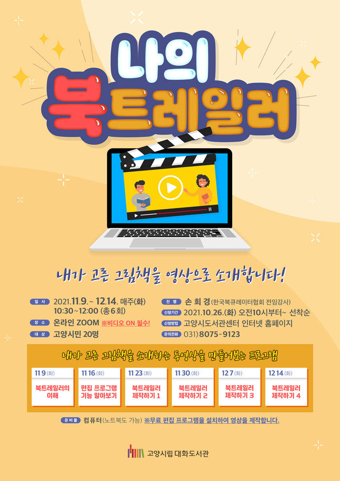프로그램 신청은 오는 10월 26일(화) 오전 10시부터 고양시도서관센터 홈페이지에서 가능하다. 기타 궁금한 사항은 일산서구도서관과로 문의하면 된다.