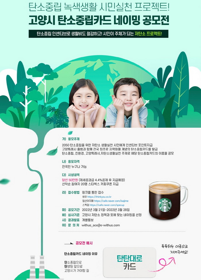 [부자동네타임즈 김인수기자] 고양시는 올해 5월 지역화폐 개념의 탄소중립 카드 발급을 앞두고 3월 21일부터 탄소중립 카드의 이름을 공모한다.