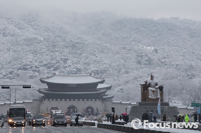 (서울=포커스뉴스) 전국 대부분 지방에 대설주의보가 내려진 3일 오전 서울 중구 광화문 뒤로 보이는 북악산자락에 눈이 쌓여있다.