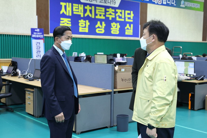 [사진설명] 재택치료추진단 종합상황실에 방문한 이재준 시장(왼쪽).